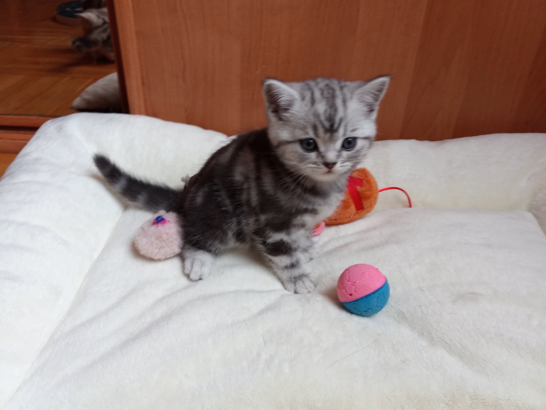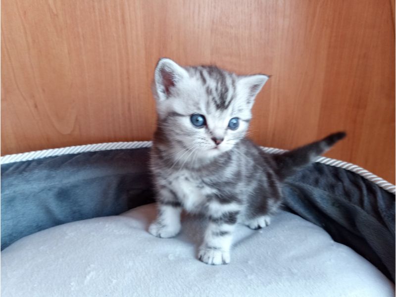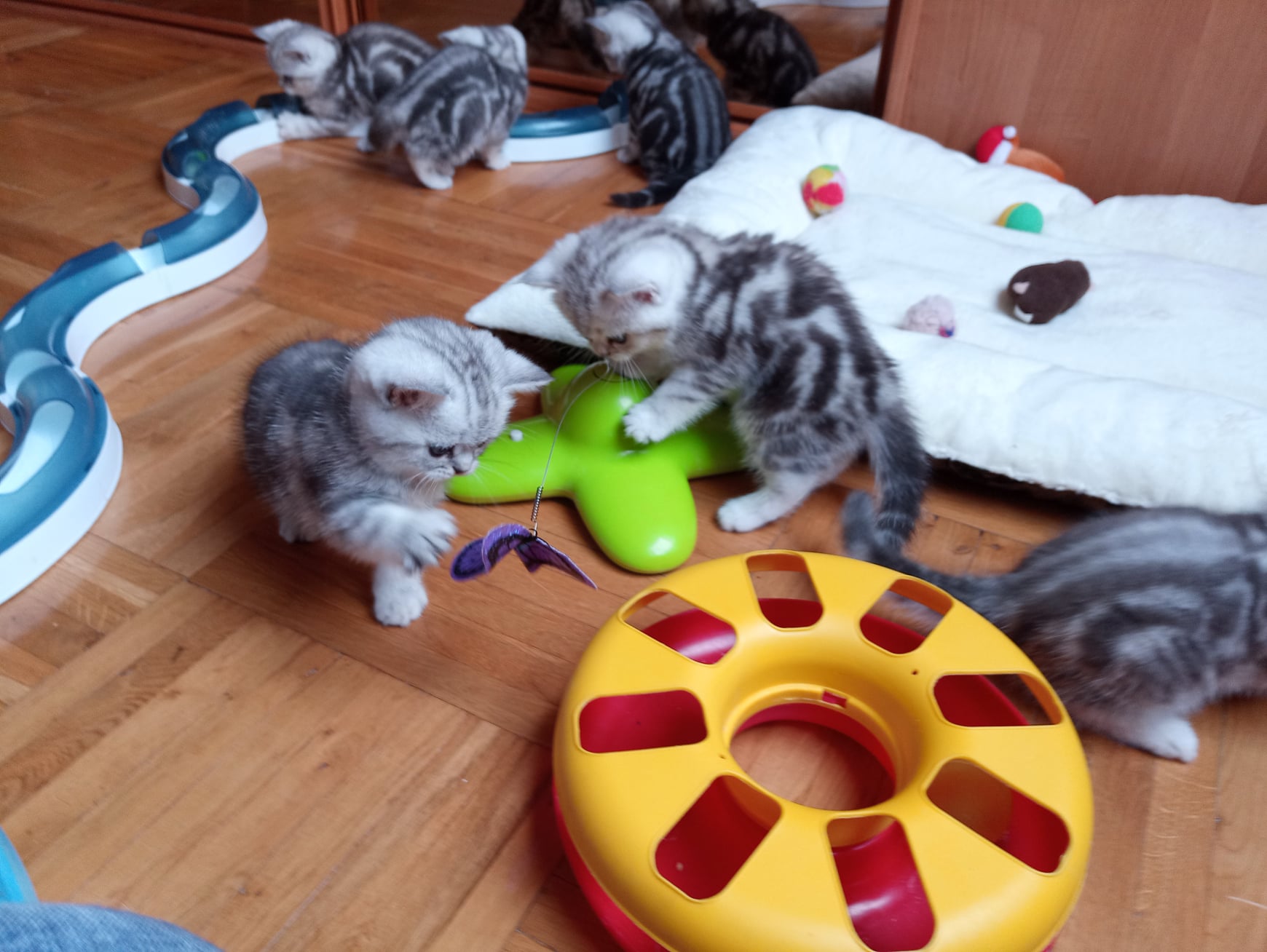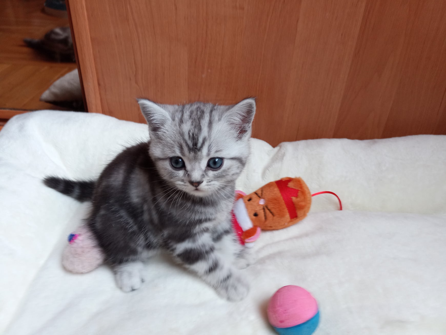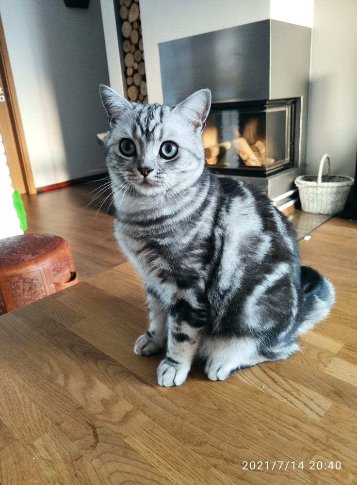 Informacje:tytuł, imię kota: IPUNO SILVER SUN*PL płeć: kocur kolor: BSH ns 22 64 data urodzenia: 2020-09-01 ojciec: SC VALENTINO VAN SONSWIJCK *NL, DVM matka: IC Daisy Silver Sun *PL, JW Opis:W miocie "U" mieliśmy tylko jednego kocurka. Maluszek jest już nauczony korzystania z kociej toalety. Jest już za etapem nauki spożywania stałych pokarmów. Pomimo tego, że jest o kilka dni młodszy od rodzeństwa z miotu "T", to najszybciej załapał jedzenie stałego pożywienia. Jednak mleko mamy jest niezastąpione. Jak się pomyli i druga mama jest bliżej , to też się podłączy. No i mamy też trzecią mamę, która też spokojnie karmi towarzystwo. Mamy dwa sąsiednie mioty i stad też te dwie mamy. Jednak trzecia też przygarnia nie swoje pasiaki - NM SC LOVE ME Silver Sun*PL, JW, DSM, DVM. W drugim miocie mamy jedną koteczkę i pięć kocurków. UNO jest bardzo rezolutny chodzi za człowiekiem jak pies i musi wszystko sprawdzić, czy jest dobrze zrobione, np. czy dobrze są posprzątane kuwety. Jeszcze w hodowli otrzymał przydomek majordomus lub dozorca.