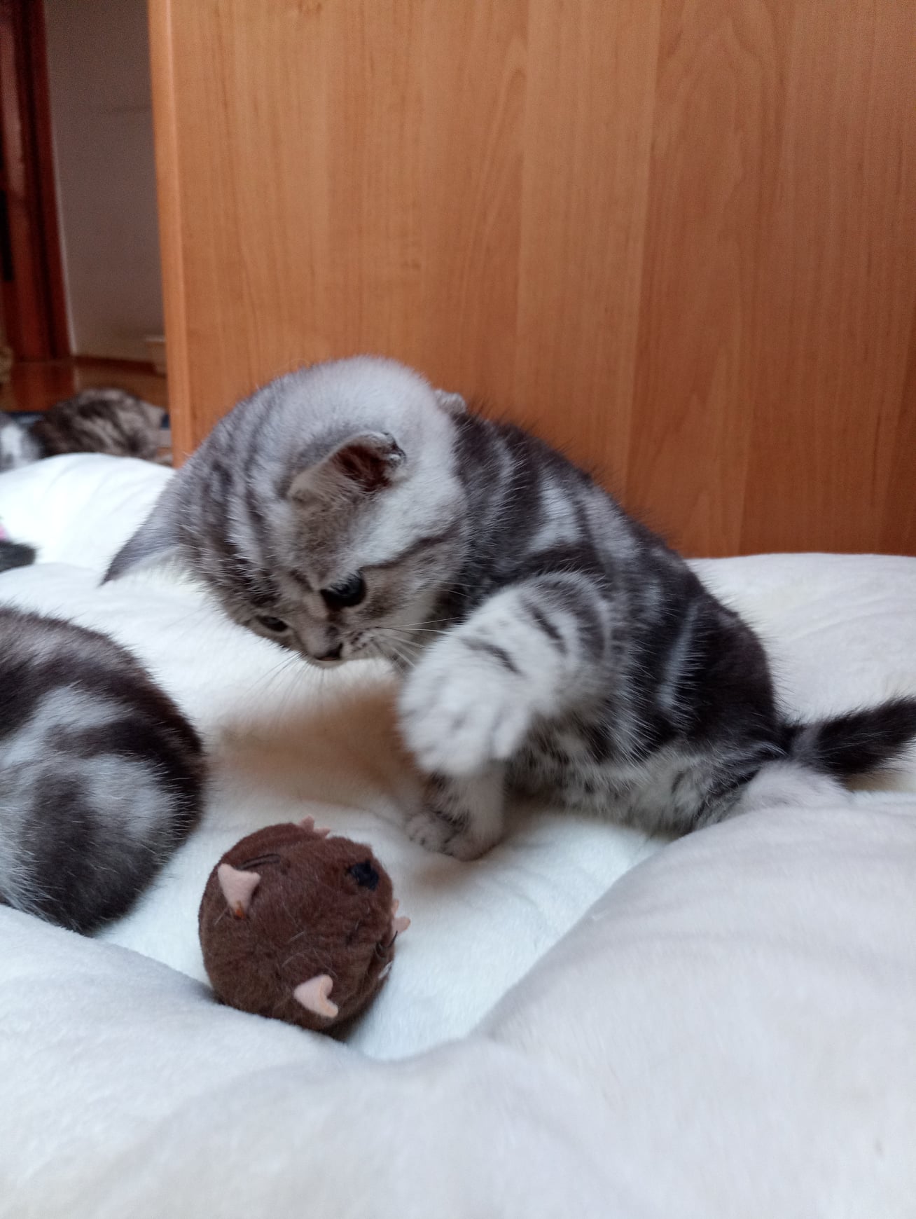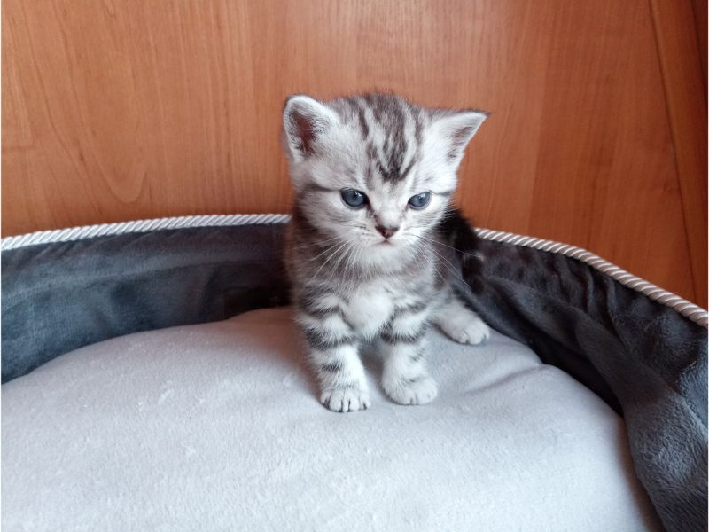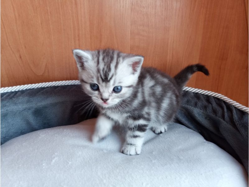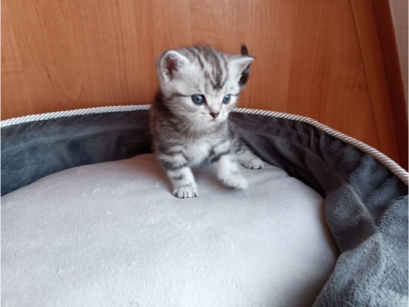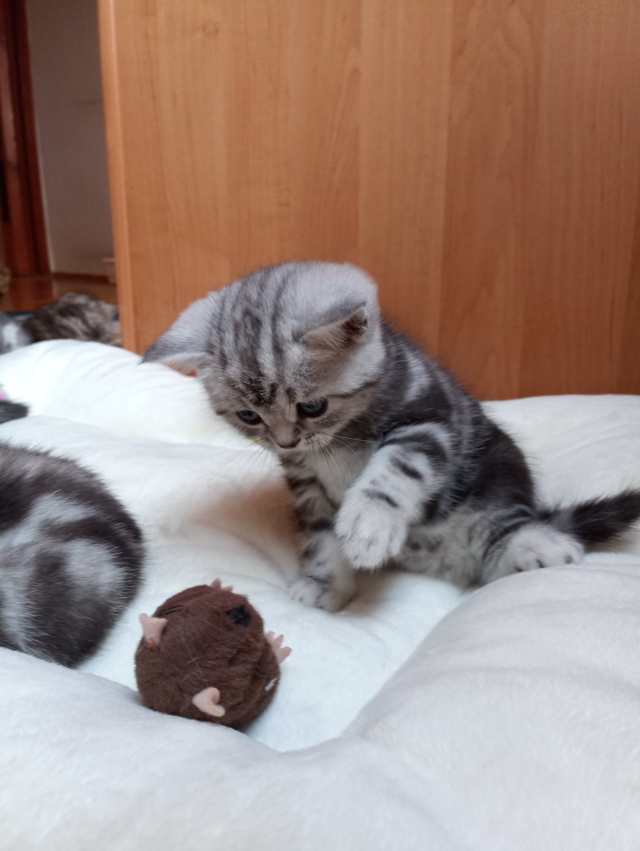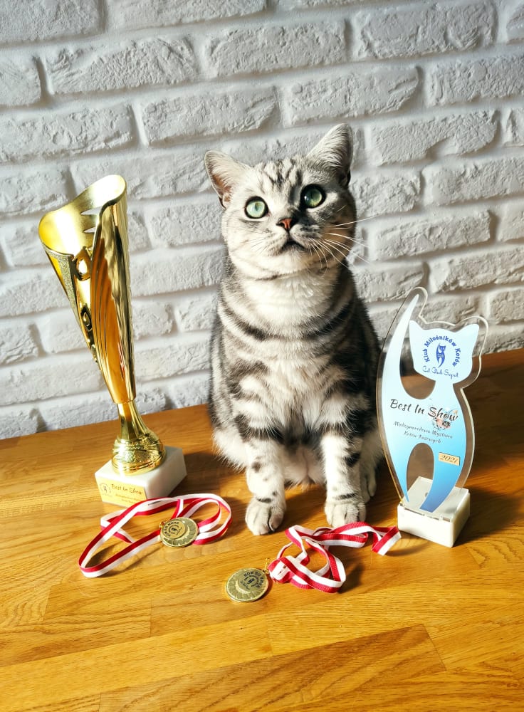 Informacje:tytuł, imię kota: IPUNO SILVER SUN*PL płeć: kocur kolor: BSH ns 22 64 data urodzenia: 2020-09-01 ojciec: SC VALENTINO VAN SONSWIJCK *NL, DVM matka: IC Daisy Silver Sun *PL, JW Opis:W miocie "U" mieliśmy tylko jednego kocurka. Maluszek jest już nauczony korzystania z kociej toalety. Jest już za etapem nauki spożywania stałych pokarmów. Pomimo tego, że jest o kilka dni młodszy od rodzeństwa z miotu "T", to najszybciej załapał jedzenie stałego pożywienia. Jednak mleko mamy jest niezastąpione. Jak się pomyli i druga mama jest bliżej , to też się podłączy. No i mamy też trzecią mamę, która też spokojnie karmi towarzystwo. Mamy dwa sąsiednie mioty i stad też te dwie mamy. Jednak trzecia też przygarnia nie swoje pasiaki - NM SC LOVE ME Silver Sun*PL, JW, DSM, DVM. W drugim miocie mamy jedną koteczkę i pięć kocurków. UNO jest bardzo rezolutny chodzi za człowiekiem jak pies i musi wszystko sprawdzić, czy jest dobrze zrobione, np. czy dobrze są posprzątane kuwety. Jeszcze w hodowli otrzymał przydomek majordomus lub dozorca.