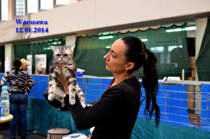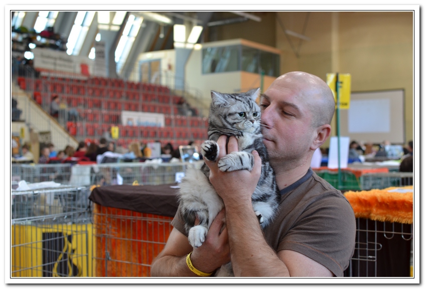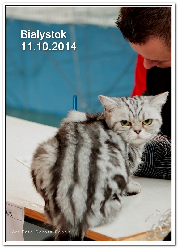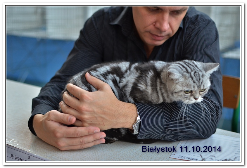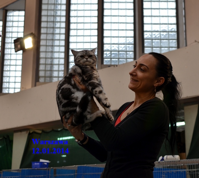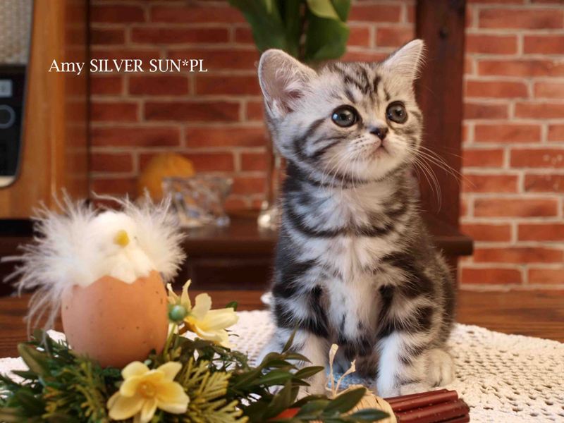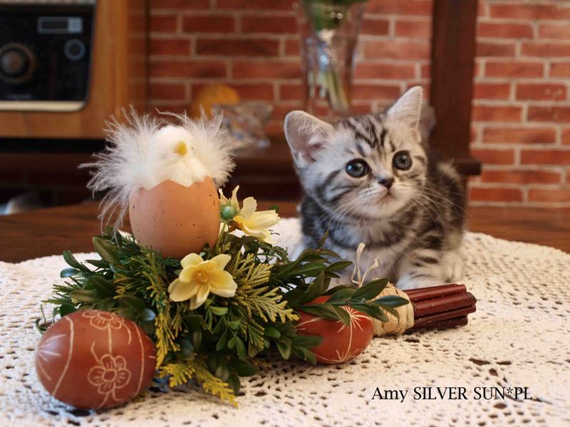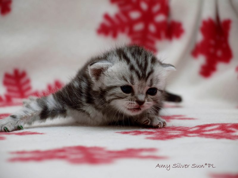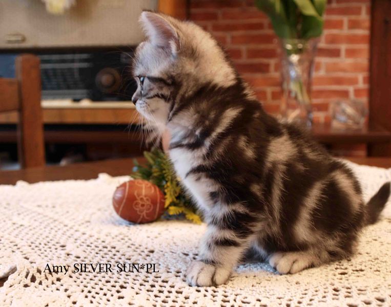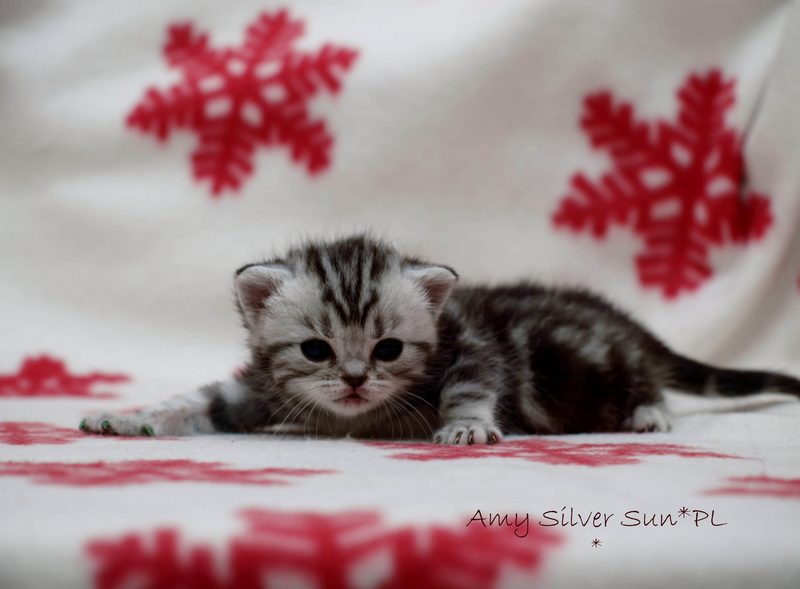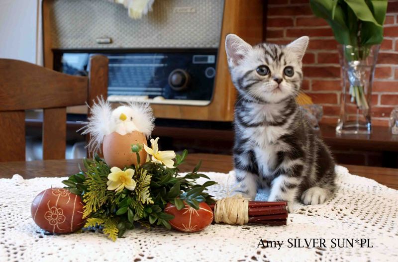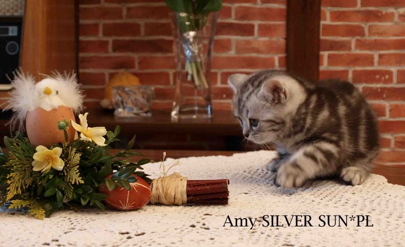 Informacje:tytuł, imię kota: SCAmy Silver Sun *PL, płeć: kotka kolor: BSH ns 22 64 data urodzenia: 2012-02-17 ojciec: CH Gordon Manikeob, JW *DE matka: IC Xistis Herbu Kadar *PL Opis:Z perspektywy czasu mogę powiedzieć, że jest „klonem” swojej mamy IC Xistis Herbu Kader*PL . Nie tylko chodzi o jej wygląd ale również o charakter. Kiedy przyszła na świat od pierwszych chwil zawładnęła moim sercem. Mała słodka pszczółka, bo tak była nazywana. Uwielbia robić baranki, nadstawiać czółko , do całowania – przecież trzeba przywitać się po powrocie do domu i pożegnać przed snem. Jeśli chodzi o sen, to tutaj jest cały rytuał obowiązkowych czynności, które trzeba wykonać – zanim zaśniemy. Nawet w tej dziedzinie uderzające podobieństwo do mamusi. Amy doskonale prezentuje się na wystawach. Zawsze sędziowie zwracają uwagę na jej duże okrągłe oczy o cudownym szmaragdowym kolorze. Nigdy nie otrzymała oceny innej niż Ex1. Raz otrzymała ocenę Ex1 bez certyfikatu w Żylinie na Słowacji – oceniała ją Pani Laura Burani-Ferrari z Woch. Argumentacja była taka: „Nie ma żadnych zarzutów do niej. Nigdy nie dałam certyfikatu 14-miesięcznemu kociakowi do Grand Interanional Champion i nie dam. To jest za wysoki tytuł na tak młodego kociaka”. Kilka miesięcy odczekaliśmy i w kolejne 4 miesiące Amy otrzymała tytuł Granda. Następnie były kolejne wystawowe sukcesy już jako pretendentka do tytułu Supreme Champion. Swój początek sukcesów wystawowych rozpoczęła w Kownie. Następnie były wystawy w Białymstoku i w Olomouc w Czechach, Tam również otrzymała nominację do BIS. Amy w ten weekend 8-9 października 2016 otrzymała dwa ostatnie certyfikaty CACS z wystawy w Białymstoku uprawniające ją do najwyższego tytułu Supreme Champion. W rodowodzie Amy posiada w przeważającej części linie De Broeckloni, Manikeob oraz kilka innych.