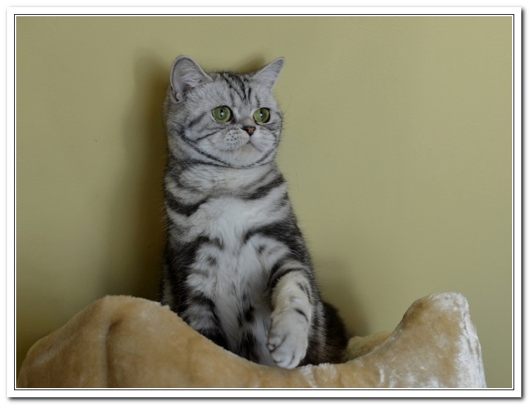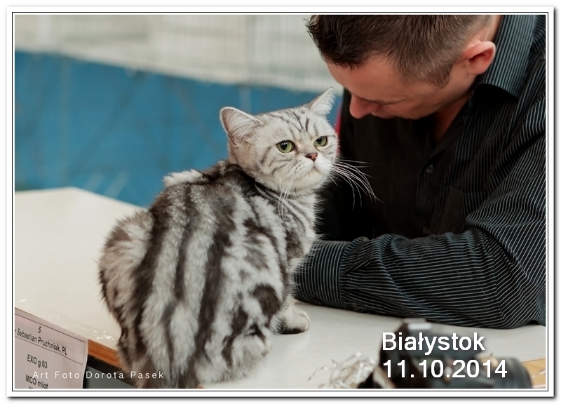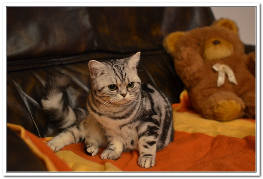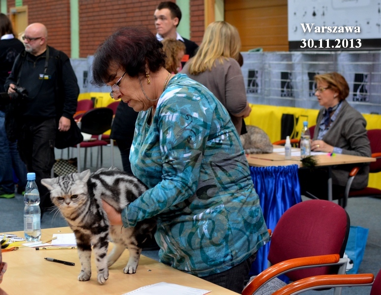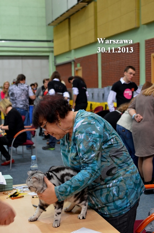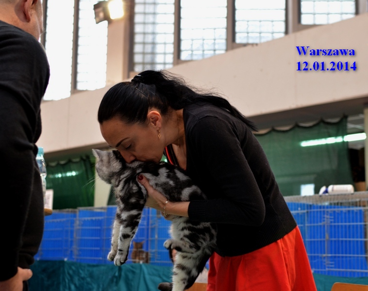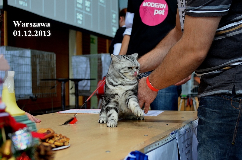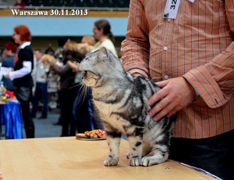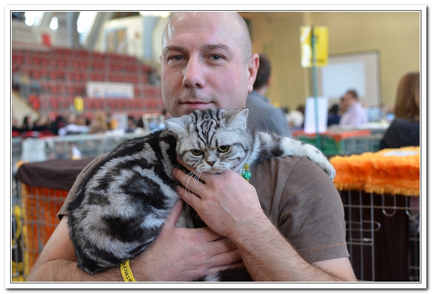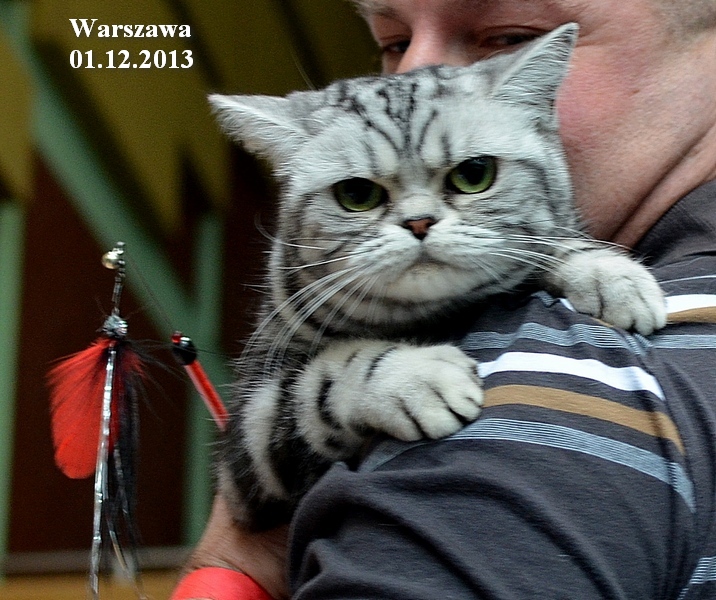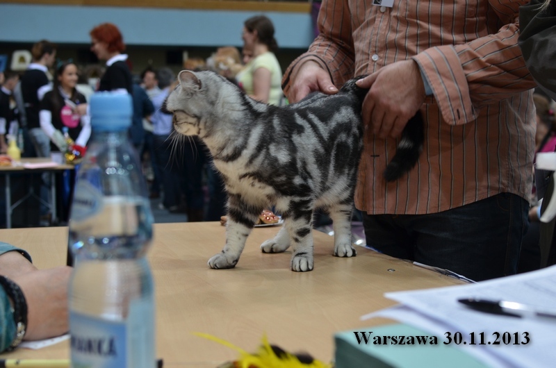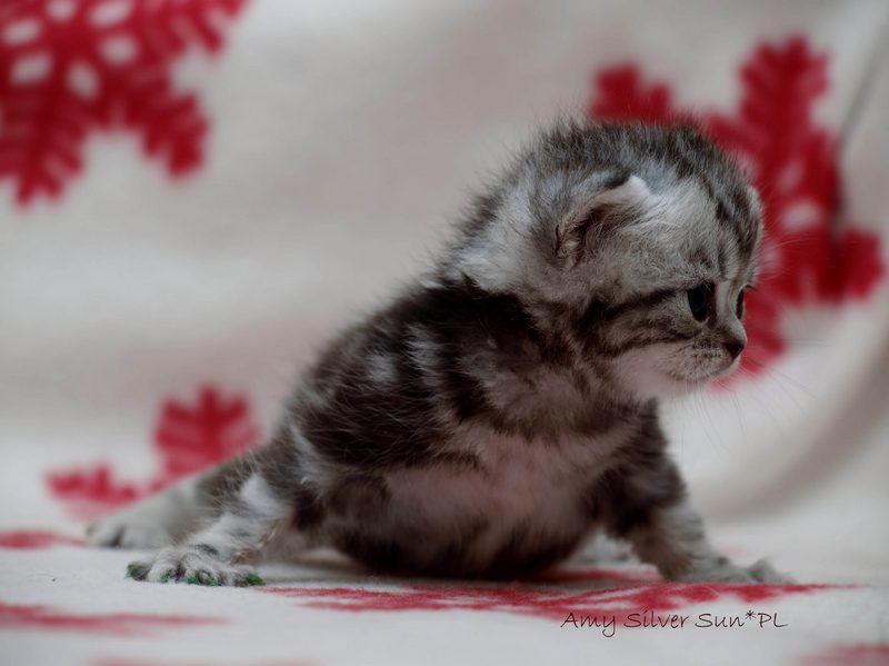 Informacje:tytuł, imię kota: SCAmy Silver Sun *PL, płeć: kotka kolor: BSH ns 22 64 data urodzenia: 2012-02-17 ojciec: CH Gordon Manikeob, JW *DE matka: IC Xistis Herbu Kadar *PL Opis:Z perspektywy czasu mogę powiedzieć, że jest „klonem” swojej mamy IC Xistis Herbu Kader*PL . Nie tylko chodzi o jej wygląd ale również o charakter. Kiedy przyszła na świat od pierwszych chwil zawładnęła moim sercem. Mała słodka pszczółka, bo tak była nazywana. Uwielbia robić baranki, nadstawiać czółko , do całowania – przecież trzeba przywitać się po powrocie do domu i pożegnać przed snem. Jeśli chodzi o sen, to tutaj jest cały rytuał obowiązkowych czynności, które trzeba wykonać – zanim zaśniemy. Nawet w tej dziedzinie uderzające podobieństwo do mamusi. Amy doskonale prezentuje się na wystawach. Zawsze sędziowie zwracają uwagę na jej duże okrągłe oczy o cudownym szmaragdowym kolorze. Nigdy nie otrzymała oceny innej niż Ex1. Raz otrzymała ocenę Ex1 bez certyfikatu w Żylinie na Słowacji – oceniała ją Pani Laura Burani-Ferrari z Woch. Argumentacja była taka: „Nie ma żadnych zarzutów do niej. Nigdy nie dałam certyfikatu 14-miesięcznemu kociakowi do Grand Interanional Champion i nie dam. To jest za wysoki tytuł na tak młodego kociaka”. Kilka miesięcy odczekaliśmy i w kolejne 4 miesiące Amy otrzymała tytuł Granda. Następnie były kolejne wystawowe sukcesy już jako pretendentka do tytułu Supreme Champion. Swój początek sukcesów wystawowych rozpoczęła w Kownie. Następnie były wystawy w Białymstoku i w Olomouc w Czechach, Tam również otrzymała nominację do BIS. Amy w ten weekend 8-9 października 2016 otrzymała dwa ostatnie certyfikaty CACS z wystawy w Białymstoku uprawniające ją do najwyższego tytułu Supreme Champion. W rodowodzie Amy posiada w przeważającej części linie De Broeckloni, Manikeob oraz kilka innych.