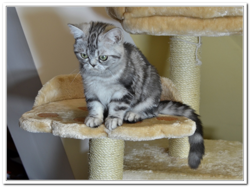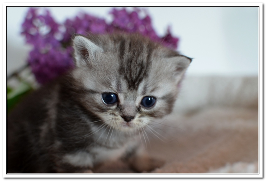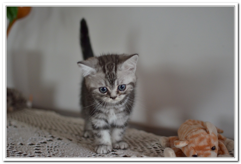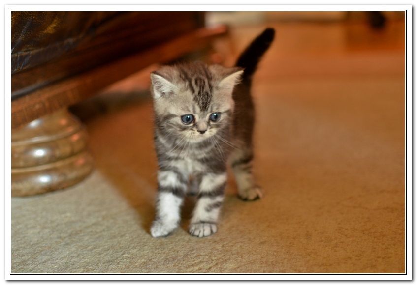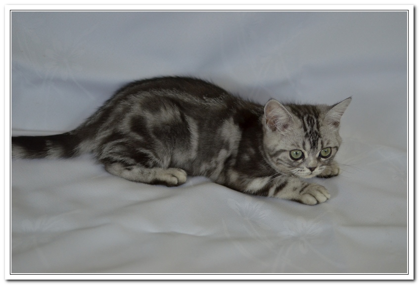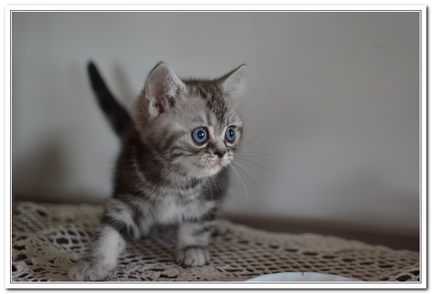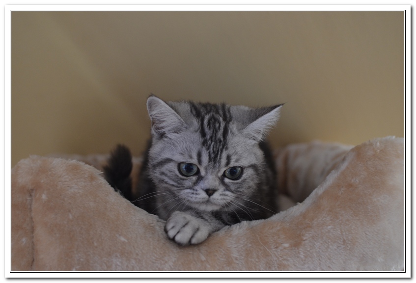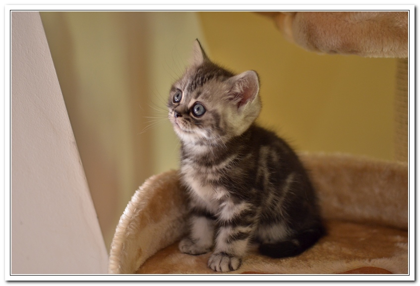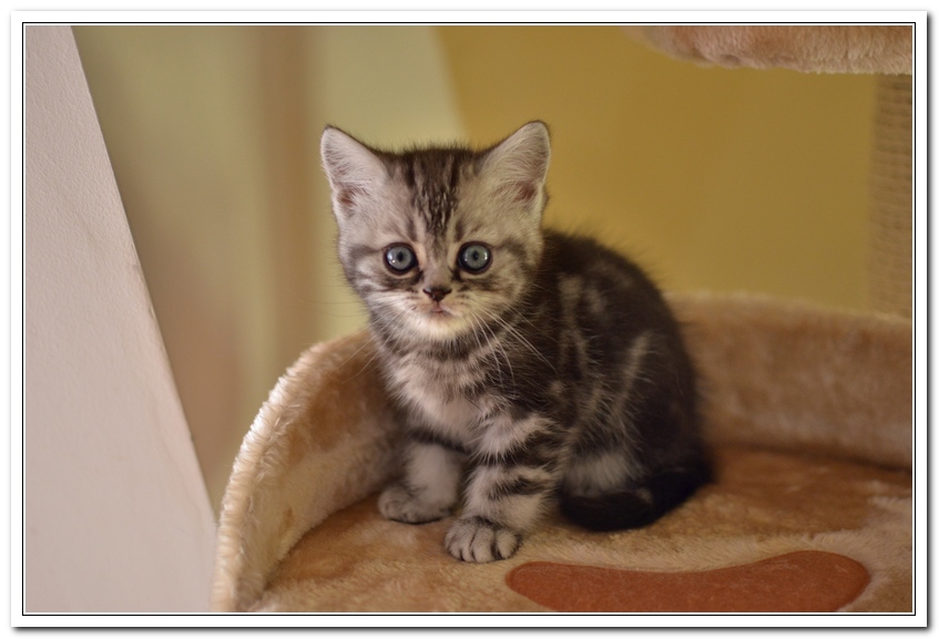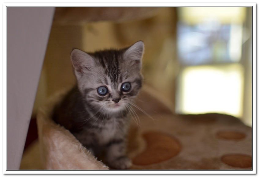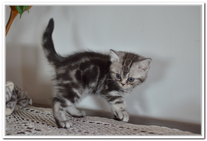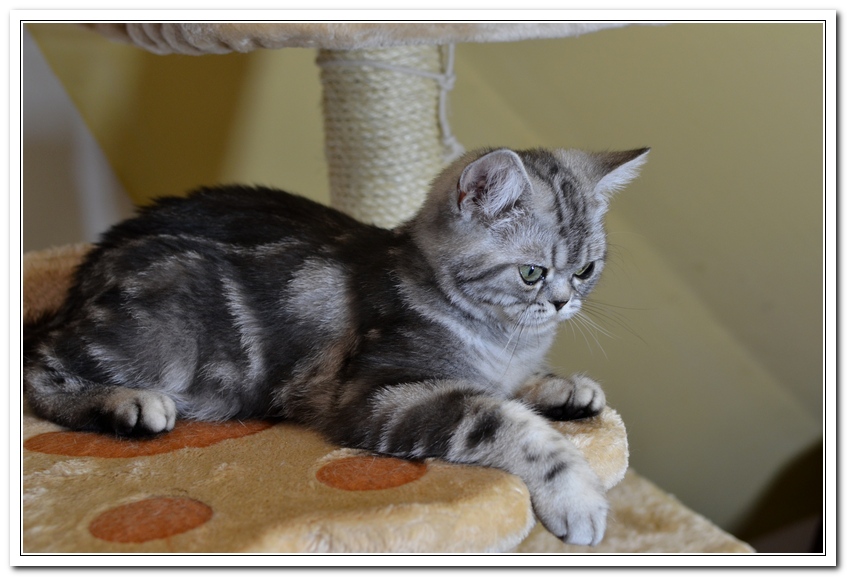 Daisy jest bardzo obiecująca jako koteczka hodowlano - wystawowa. Ma bardzo ładną kompaktową budowę ciała, ciemny kontrast futra i ładny rysunek. Charakteryzuje się piękna okrągłą głową z wysokim czołem ładnie zaokrąglonym. Jej oczy są duże okrągłe z doskonałą ekspresją. Obecnie zaczynają wybarwiać się na cudowny szmaragdowy kolor. Daisy jest równie piękna jak jej rodzeństwo:)Uwielbia przytulać się, zasypiać w łóżku, a przy tym mruczeć.