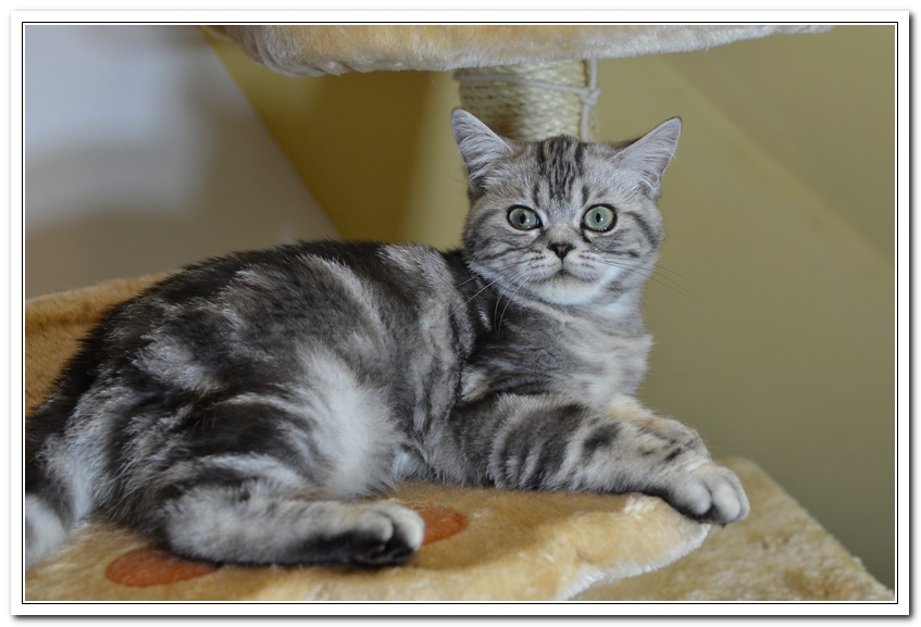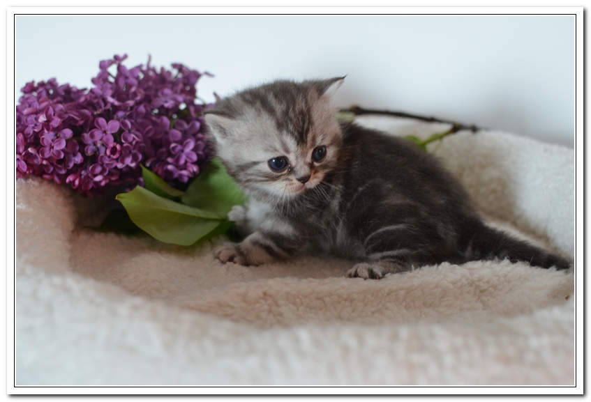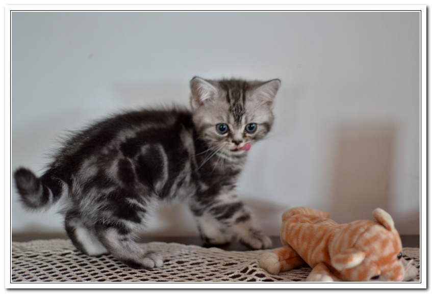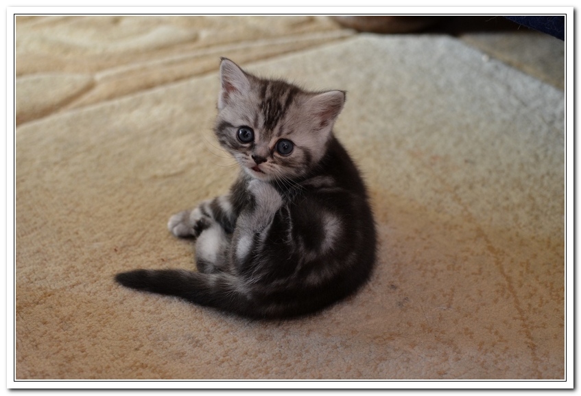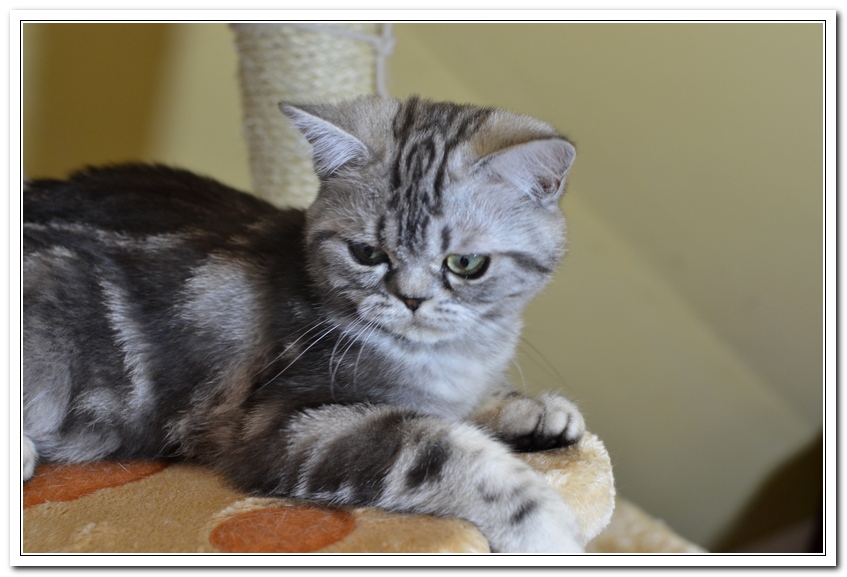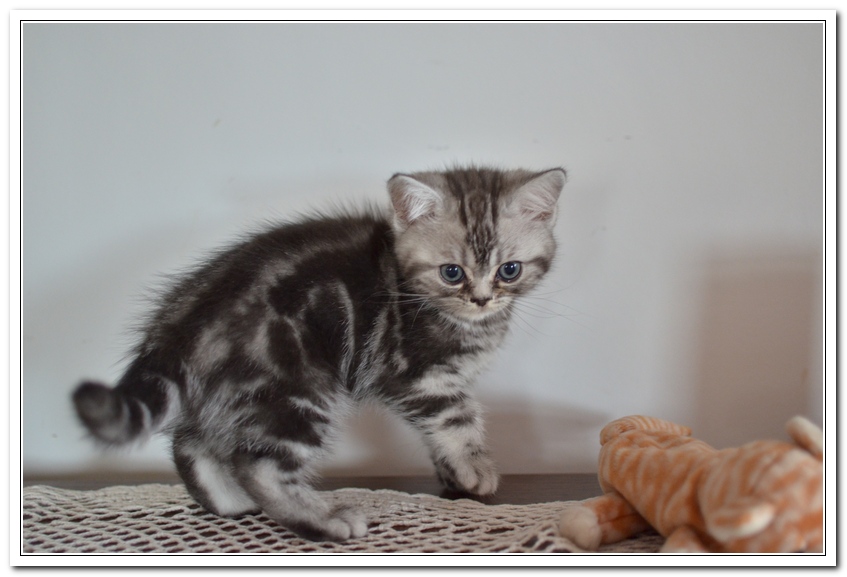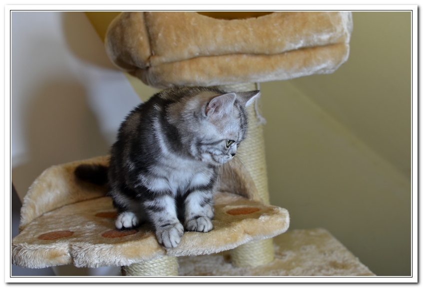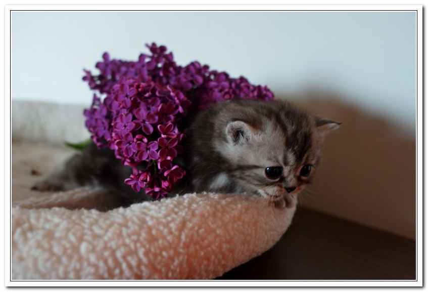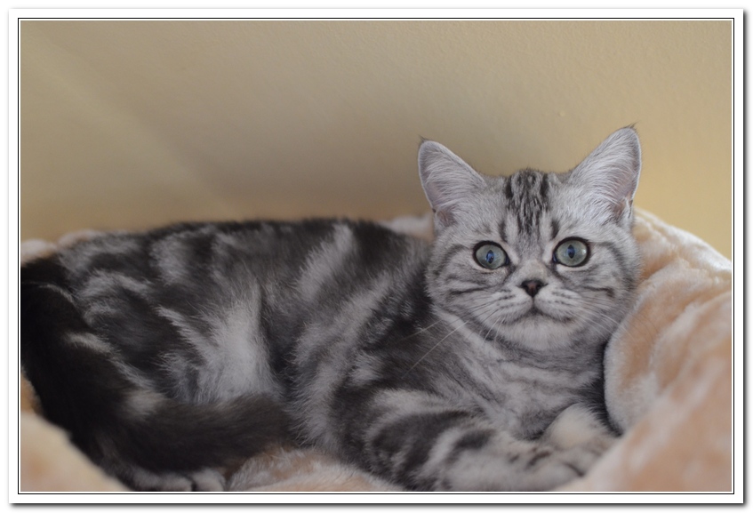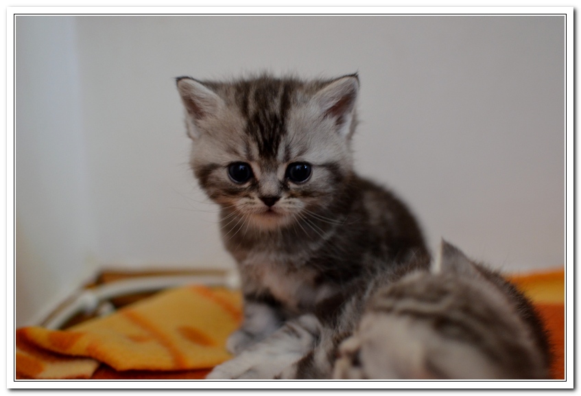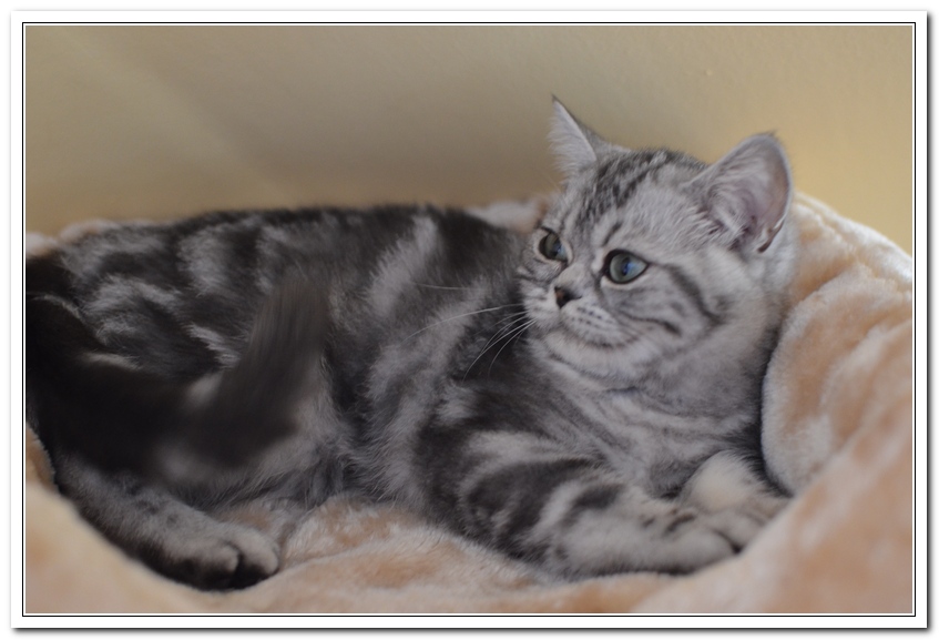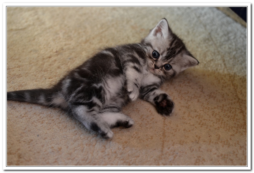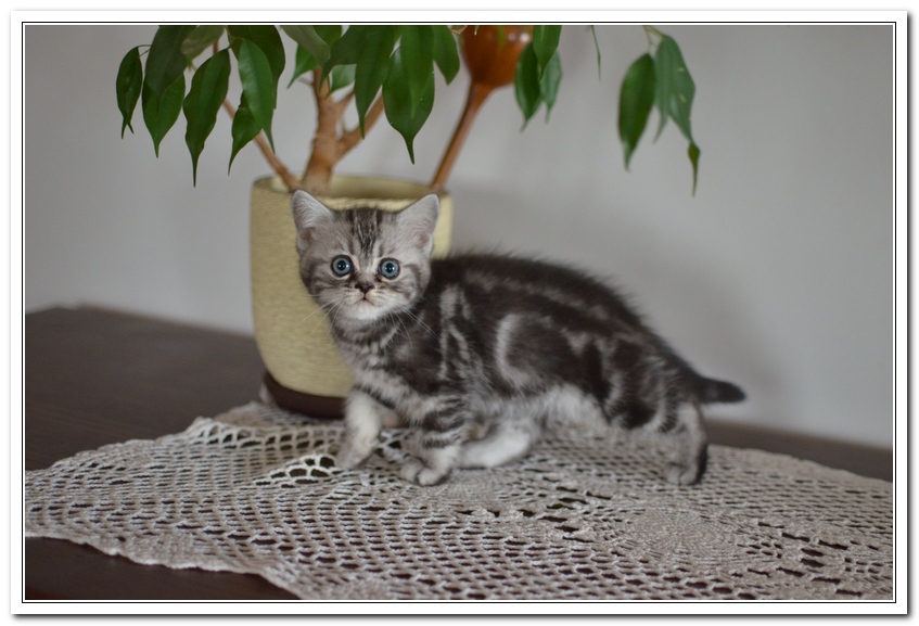 Daisy jest bardzo obiecująca jako koteczka hodowlano - wystawowa. Ma bardzo ładną kompaktową budowę ciała, ciemny kontrast futra i ładny rysunek. Charakteryzuje się piękna okrągłą głową z wysokim czołem ładnie zaokrąglonym. Jej oczy są duże okrągłe z doskonałą ekspresją. Obecnie zaczynają wybarwiać się na cudowny szmaragdowy kolor. Daisy jest równie piękna jak jej rodzeństwo:)Uwielbia przytulać się, zasypiać w łóżku, a przy tym mruczeć.