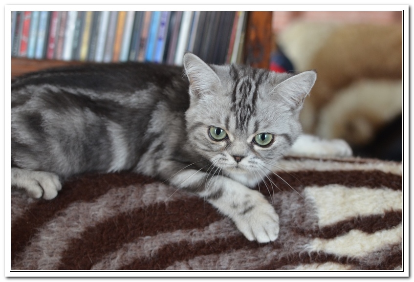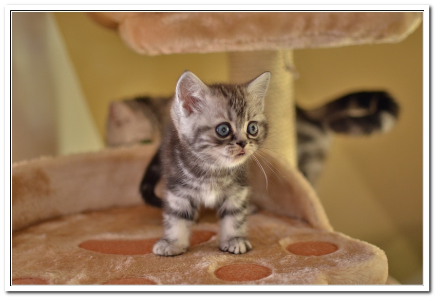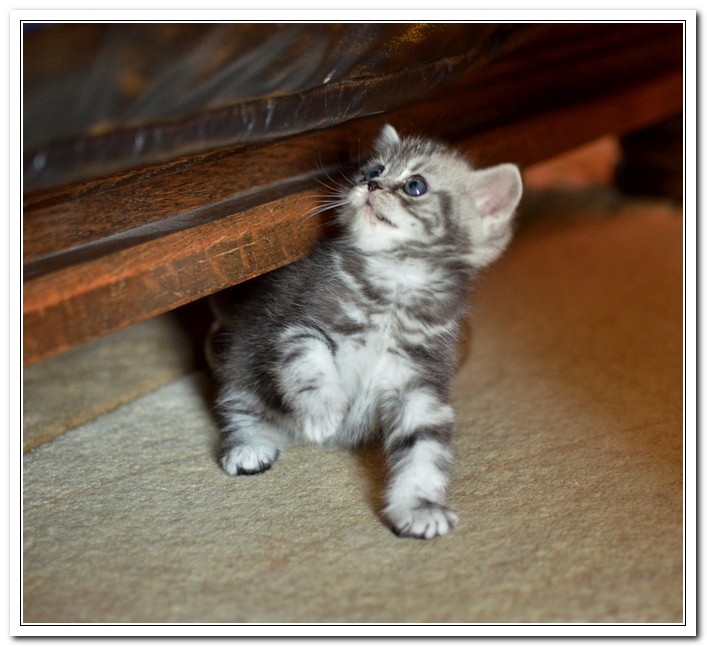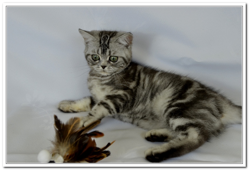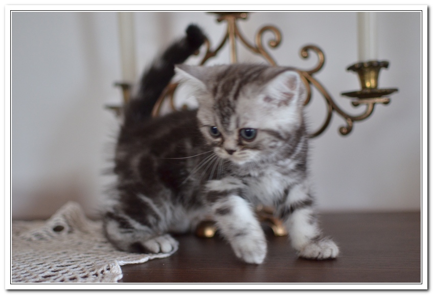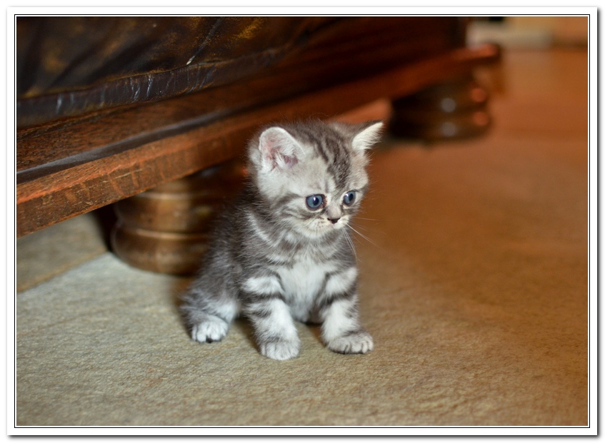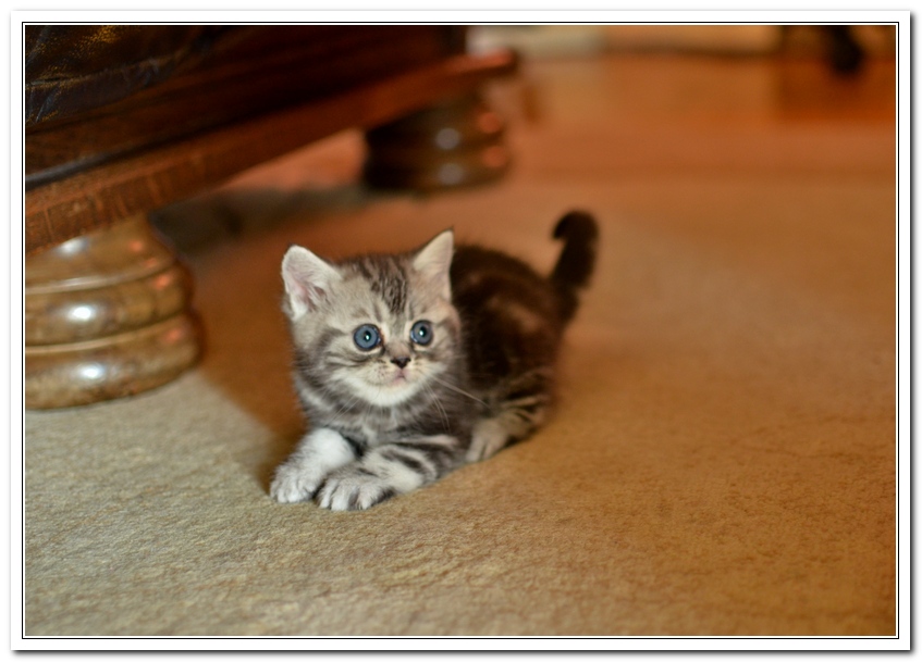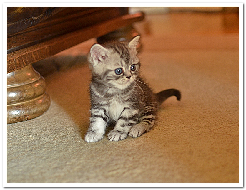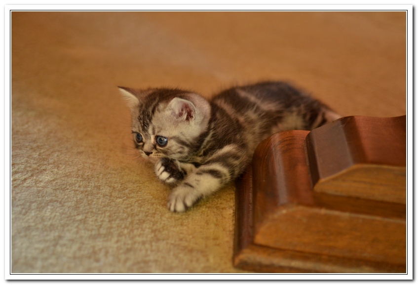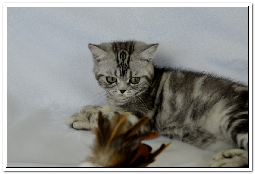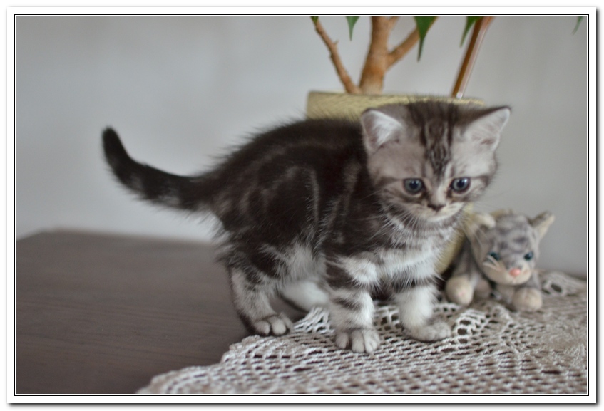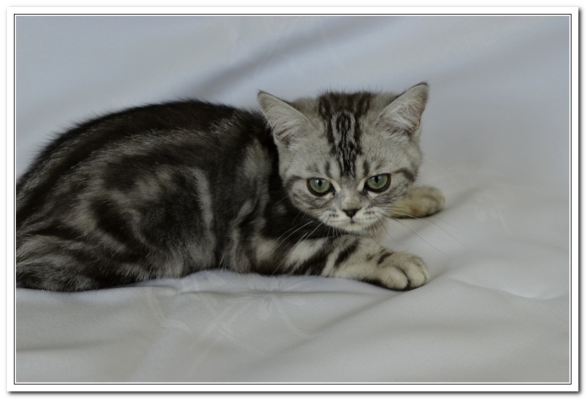 Daisy jest bardzo obiecująca jako koteczka hodowlano - wystawowa. Ma bardzo ładną kompaktową budowę ciała, ciemny kontrast futra i ładny rysunek. Charakteryzuje się piękna okrągłą głową z wysokim czołem ładnie zaokrąglonym. Jej oczy są duże okrągłe z doskonałą ekspresją. Obecnie zaczynają wybarwiać się na cudowny szmaragdowy kolor. Daisy jest równie piękna jak jej rodzeństwo:)Uwielbia przytulać się, zasypiać w łóżku, a przy tym mruczeć.
