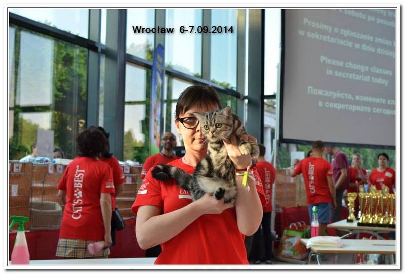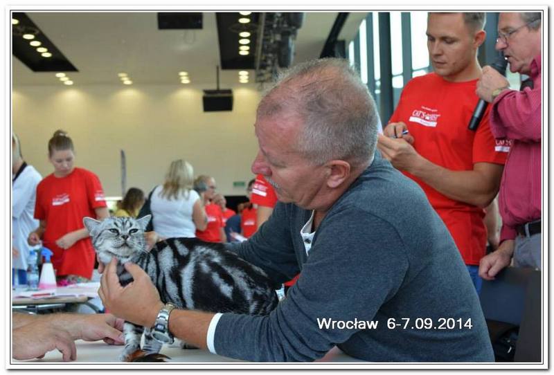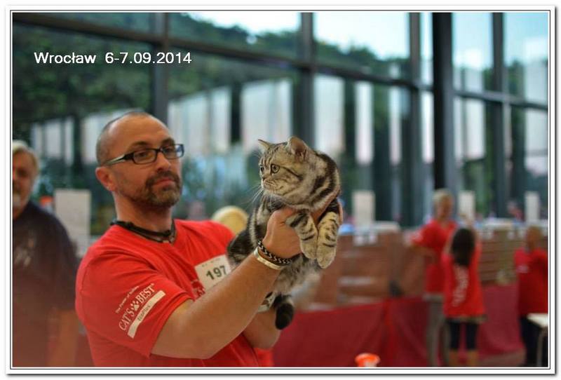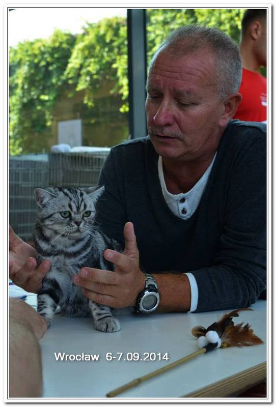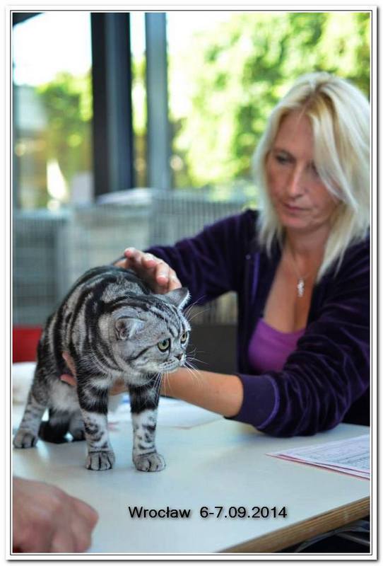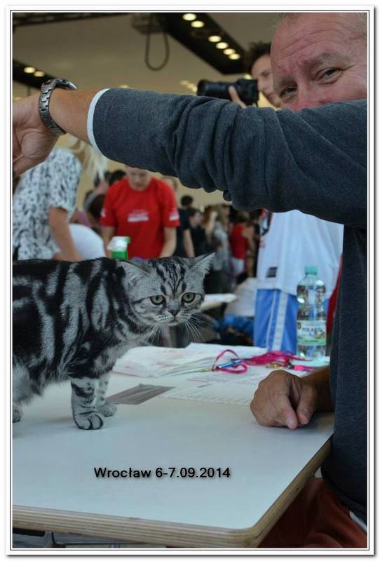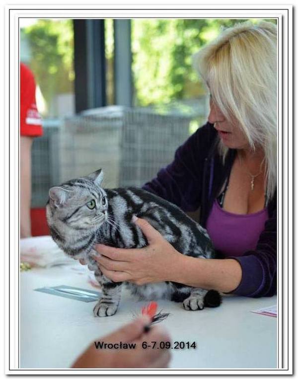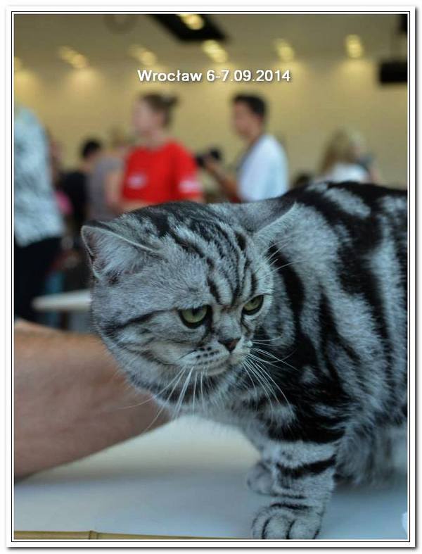 Informacje:tytuł, imię kota: GICYOU TOO Vale of Proud's *DE płeć: kotka kolor: BSH ns 22 64 data urodzenia: 2014-02-24 ojciec: Kalypso Vale of Proud's matka: WE LOVE U Tabby Dream Opis:You Too kilka razy była prezentowana w kategorii 12 i 11 w Kittenach i Juniorach na 6 wystawa otrzymała cztery razy Nom do BIS i raz BIV ( najlepszej w kolorze). Jest bardzo obiecującą koteczką! Pierwsza wystawa You Too w klasie otwartej była w Warszawie 17 stycznia 2015r. Swój debiut jako dorosły kot miała u sędziego Ireneusza Pruchniaka - otrzymała Ex1 i pierwszy certyfikat CAC do Championa. Drugiego dnia swoim wprawnym okiem oglądał i oceniał ją sędzia Sebastian Pruchniak. Otrzymała ocenę Ex1, CAC, kolejny certyfikat do wystawowego, a także BIV (najlepszej w kolorze). Tydzień później wybraliśmy się do Wiednia, była to moja pierwsza wizyta wystawowa w Austrii. You Too spisała się doskonale! Pierwszy raz widziałem tyle kotów silver tabby na jednej wystawie - było ich 15 sztuk. Tylko w klasie otwartej było sześć kotów, w tym 5 kotek. W sobotę oceniał nas sędzia z Holandii - Ad de Bruijn, który jest również hodowcą tego koloru kotów brytyjskich z 35 letnim stażem. YOU TOO została wybrana kotką numer jeden wygrywając z koteczką, która ma zaszczytny tytuł Junior Winnera. Otrzymała ostatni certyfikat uprawniający ją do tytułu Championa w dniu ukończenia 11 miesięcy. W niedzielę oceniał nasz szef FIFe Eric Reijers, który był nią zachwycony. Stwierdził, że jest bardzo obiecującą kotką. Jesteśmy bardzo zadowolenie z osiągnięć YOU TOO !