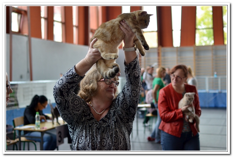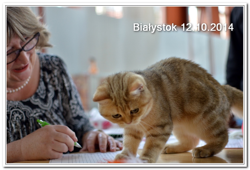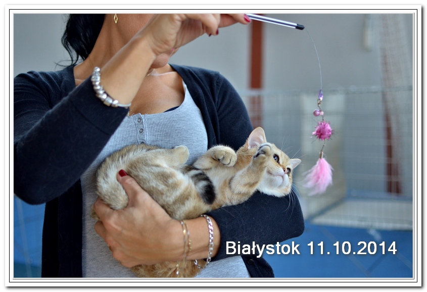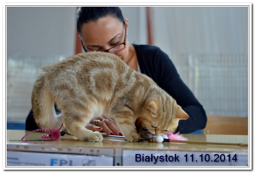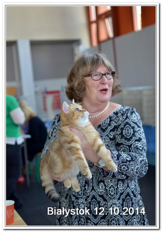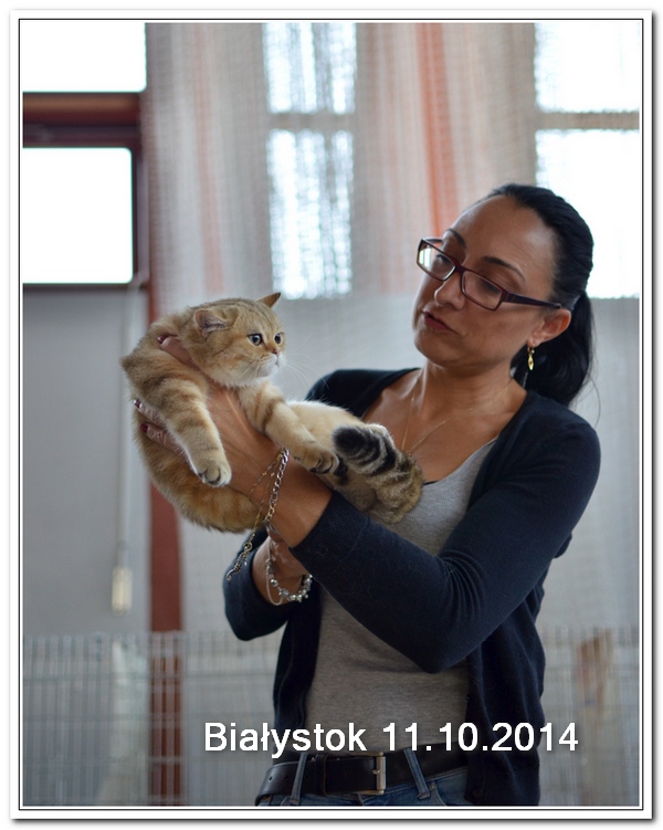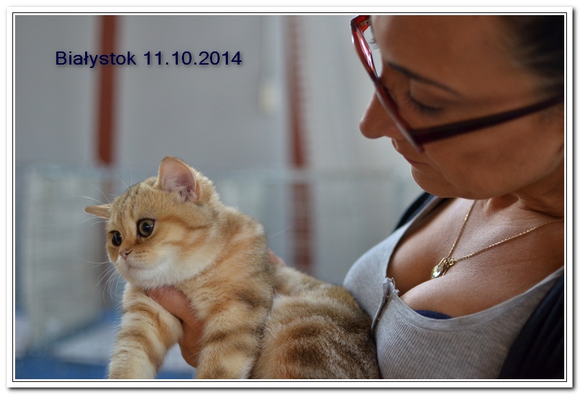 Informacje:tytuł, imię kota: ICZVEZDOCHKA SWEET BEAST* UA płeć: kotka kolor: BSH ny 22 64 data urodzenia: 2014-05-08 ojciec: IC GOLDEN NIKODEMOS NO DEMETRA* LV matka: DIAMOND BREESE DOLORES Opis:Gwiazdka przyjechała do Lublina tuż przed godziną 7 rano, pewnego wrześniowego poranka. Miała wtedy skończone cztery miesiące. Jest pierwszym kotem w Hodowli Silver Sun o umaszczeniu złota klasycznie pręgowana - inaczej mówiąc złota tabby (BSH ny 22 64) z zielonymi oczami. Gwiazdka otrzymała przydomek w mojej hodowli - Rudzielec lub Rudi. Przyznam, że zawsze zastanawiałem się czy charakter kota jest związany z kolorem futra. Z moich późniejszych obserwacji wynika, że jest. A mogę to stwierdzić na podstawie Rudej i później dwóch dziewczyn z miotu "F" FANTASY i FORTUNY. Ruda swoim usposobieniem i charakterem przypomina trochę "szmacianą lalkę". Jest bardzo ugodowym kotem, z niesamowitym charakterem do przytulania i do zabawy. Piłeczki, sznurki a zwłaszcza piórka wprawiają Rudzielca o podwójne a nawet potrójne doładowanie baterii "Powera" do zabawy. Podczas debiutu wystawowego w Białymstoku, sędzina i wieloletni hodowca Pani Marta Ziemiańska zakochała się w tym słodkim Rudzielcu. Prawie cała wystawę Ruda spędziła na rękach i kolanach u Pani Marty, poddając się pocałunkom, mizianiu i pieszczotom. Wyglądała na szczególnie zadowoloną. Gwiazdka doskonale radzi sobie na wystawach. Swój debiut miała na wystawie w Białymstoku 2014 roku. Pani Sędzina Hanne Sofie Sneum z Danii, była zachwycona typem, urodą i temperamentem Gwiazdki. Na innej wystawie sędzia Henry Hornell zapytał mnie dlaczego ja jej nie próbuję zrobić tytuł Junior Winner. Żałuję trochę, że ona nigdy nie będzie miała prestiżowego tytułu DVM. W Polsce nigdy nie spotkałem innego kota w tym kolorze, nie wspomnę już o trzech, żeby otrzymać tytuł BIV.